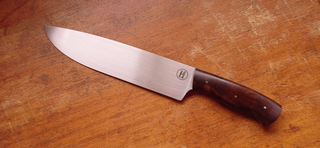 Facas de churrasco/cozinha em aço 1070 com 3mm de espessura entre 9″e 6″ de lâmina, desbaste Full flat e têmpera seletiva. Faca Full Tang, cabo em madeira natural ou a escolha, pinos em inox, design anatômico, extremamente leve e afiação bem agressiva.